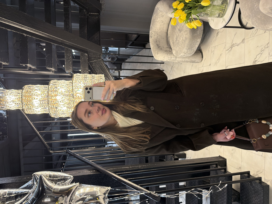 The image depicts a woman taking a mirror selfie in a modern, upscale interior. The specific location within Moscow, Russia, is not identifiable from the image. The woman, appearing to be in her 20s or 30s with long light brown hair, wears a dark brown double-breasted overcoat over a light-colored high-necked top. She holds a light-colored smartphone in her right hand, angled to capture her reflection. A silver ring is visible on her left ring finger, and her fingernails are painted light pink. In her left hand, she carries a dark brown handbag featuring a decorative strap adorned with multicolored beads. The environment includes a prominent, multi-tiered crystal chandelier suspended from the ceiling in the background. To the left, a dark-colored open-tread staircase with metal railings ascends, with several silver star-shaped foil balloons tied with white ribbons positioned nearby, suggesting a celebratory occasion. To the right, a light grey upholstered armchair with a unique curved design is situated next to a small, round side table with a white marble-patterned top. On the table, a clear glass vase holds a bouquet of bright yellow tulips. The floor is composed of white marble-patterned tiles with grey veining. The walls are dark, and reflections suggest a spacious area or hallway beyond. The scene is well-lit, conveying a sophisticated and contemporary aesthetic.