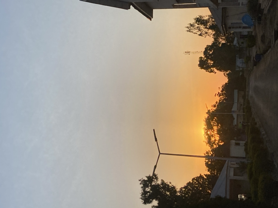 An image shows a sunset landscape. Silhouetted trees and buildings line the right side of the scene. A street lamp stands out against the sun's glow. The sky shifts from blue-gray to orange. An overhead architectural element appears at the top of the frame.
