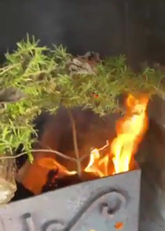 fire in a metal container inside a brick structure. The fire is burning wood and foliage, including what appears to be rosemary. The person in the video uses a piece of rosemary to fan the flames. The container is dark colored, and has an ornate design on the side. The brick structure behind the container looks like a fireplace or oven. There is smoke rising from the burning material.