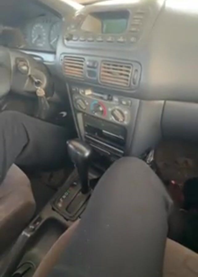 The interior of a car is shown. The car is parked and the gear stick is in park. Two people wearing dark clothing are in the front seats. The car interior is mostly dark colored plastic and fabric. The dashboard is visible and slightly dusty. The front windows are not in the frame. The audio captures a conversation between the two people in the car.