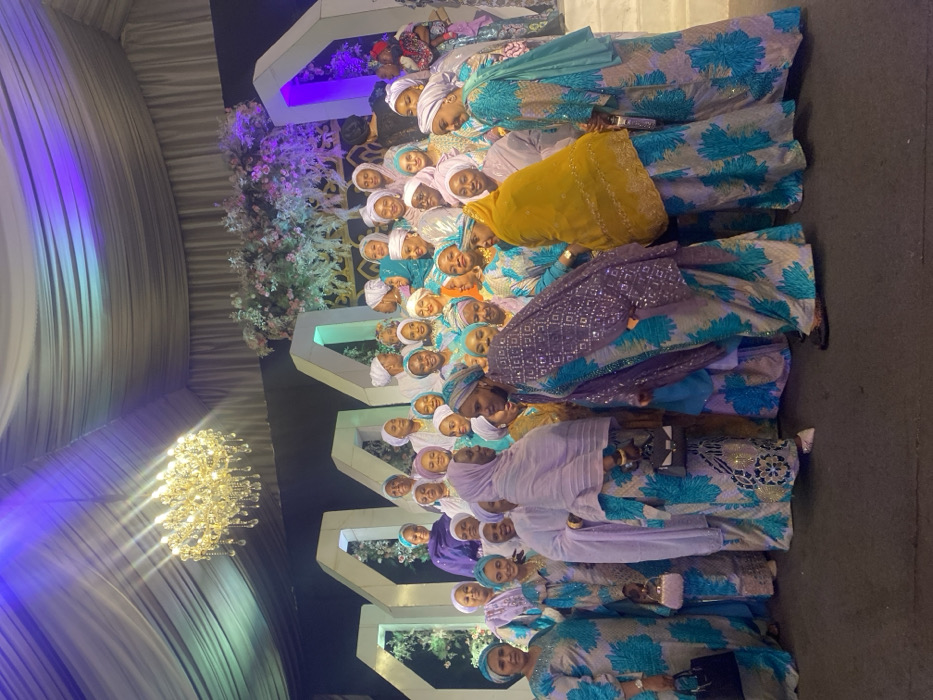 A large group of women, all wearing head coverings, pose for a picture indoors. Many wear outfits featuring a blue and teal floral pattern. Some are adorned in distinct coverings: one in a shimmery yellow, another in a patterned purple, and another in light purple. A chandelier hangs from the ceiling. Behind the group are decorative elements, including geometric shapes with embedded lighting and flower arrangements.