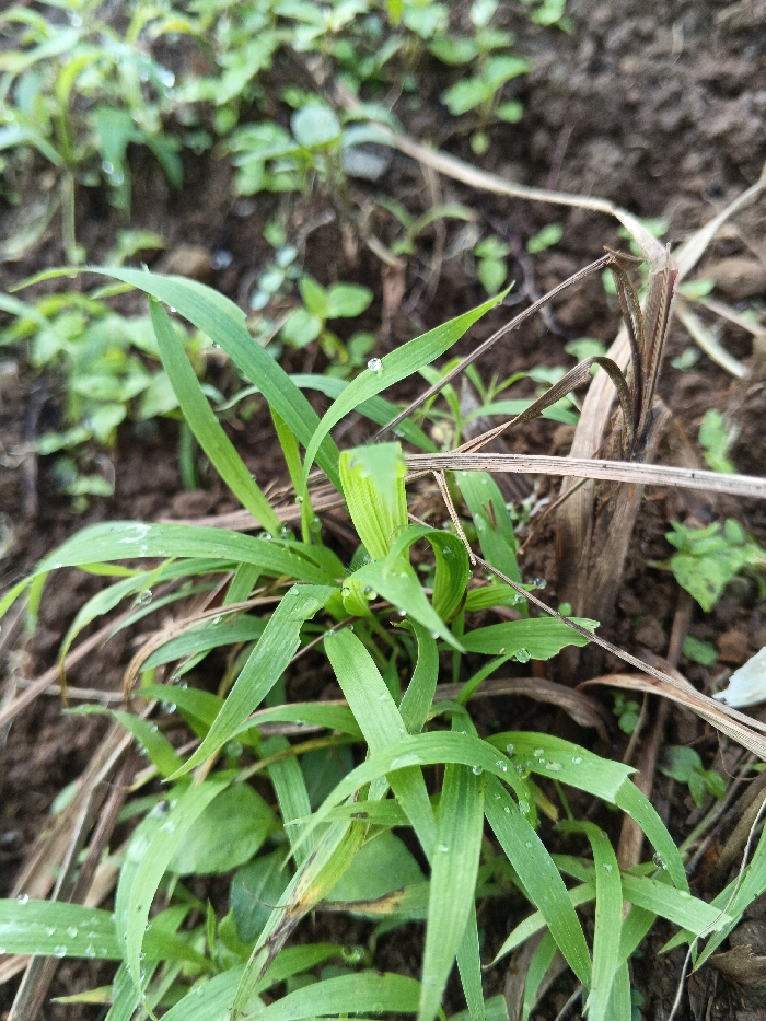 Lush green grass sprouts amidst dark soil. Delicate dew drops cling to the blades, sparkling in the soft light. Smaller green plants grow nearby, nestled amongst the grass. A few dry, brown stalks lie scattered, adding texture to the scene. The overall impression is one of fresh growth and natural beauty.