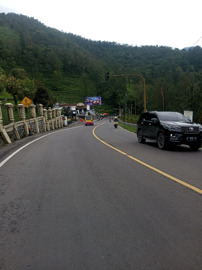 The image captures an asphalt road curving slightly to the left through a mountainous, verdant landscape under an overcast sky. The road features a solid white line on its immediate left edge and a double solid yellow line delineating the center. In the mid-ground, a black Toyota Fortuner SUV, bearing Indonesian license plate "B 1839 UF," is positioned on the right side of the road, facing the viewer. Further down the road on the left lane, a yellow and pink microcar travels away from the viewer, trailed by two motorcycles, each with a single rider. To the left of the road, a decorative concrete barrier with stone cladding at its base runs parallel to the road. A yellow diamond-shaped sign with a black pedestrian crossing symbol is affixed to this barrier. Behind the barrier, several structures are visible, including a building with a dome-like roof and a large billboard displaying colorful food advertisements. An overhead traffic light pole extends across the road from the right, supporting dark signal lights. The background is dominated by steep, lush green mountainsides, with visible terraced cultivation, consistent with tea plantations, on the lower slopes. The overall environment suggests a mountainous region in Indonesia, not Ariyalai, Sri Lanka, based on the vehicle's license plate. No pedestrians are distinctly visible.