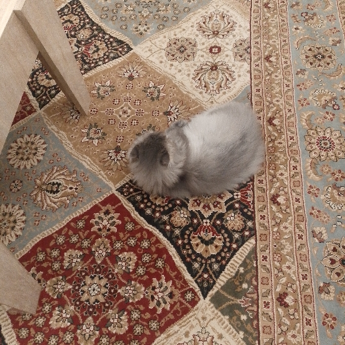 The scene depicts an indoor setting in the city of Baghdad, Iraq. A small, light grey, fluffy animal, likely a rabbit or a small cat, is curled up and resting on a multi-patterned rug. The animal's head is tucked into its body, which forms a compact, rounded shape. The rug features a patchwork design with distinct segments of varying colors, including beige, light blue, dark red, black, and olive green. Each segment contains intricate floral and curvilinear motifs. A visible border pattern, primarily in beige and light blue with repeating floral elements, runs along the right side of the frame. A light-colored, possibly wooden or laminate, furniture leg is partially visible in the upper left corner of the image, resting on the rug. No people are visible.