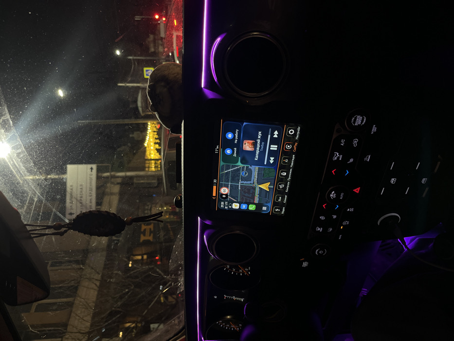 The image depicts an interior view from a stationary vehicle at night, looking out through its windshield onto a city street in Krasnodar, Russia