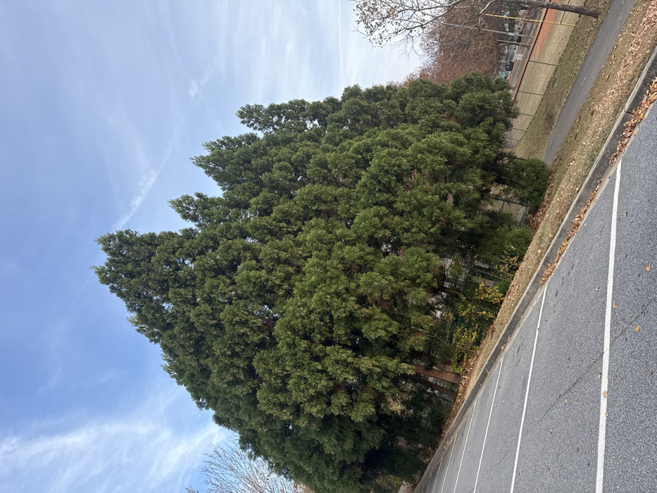A group of tall, dense evergreen trees occupies the left side of the frame, reaching towards a bright blue sky with wispy clouds. To the right of the trees, a paved parking lot with white lines extends into the foreground. Beyond the parking lot is a grassy area alongside a path, with bare trees visible in the background. The scene appears to be outdoors on a partly cloudy day.