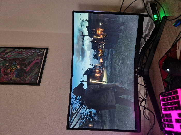 computer monitor displaying a video game. The scene in the video game is an evening shot of a town with a dirt road and wooden buildings on either side. A lone figure in a black coat and hat is standing in the middle of the road. A black computer mouse is lying next to a keyboard on a desk in the foreground. The monitor is on a stand and is connected to wires that run to a small black box and a green light. The image was taken in a bedroom in Kernen im Remstal, Germany.