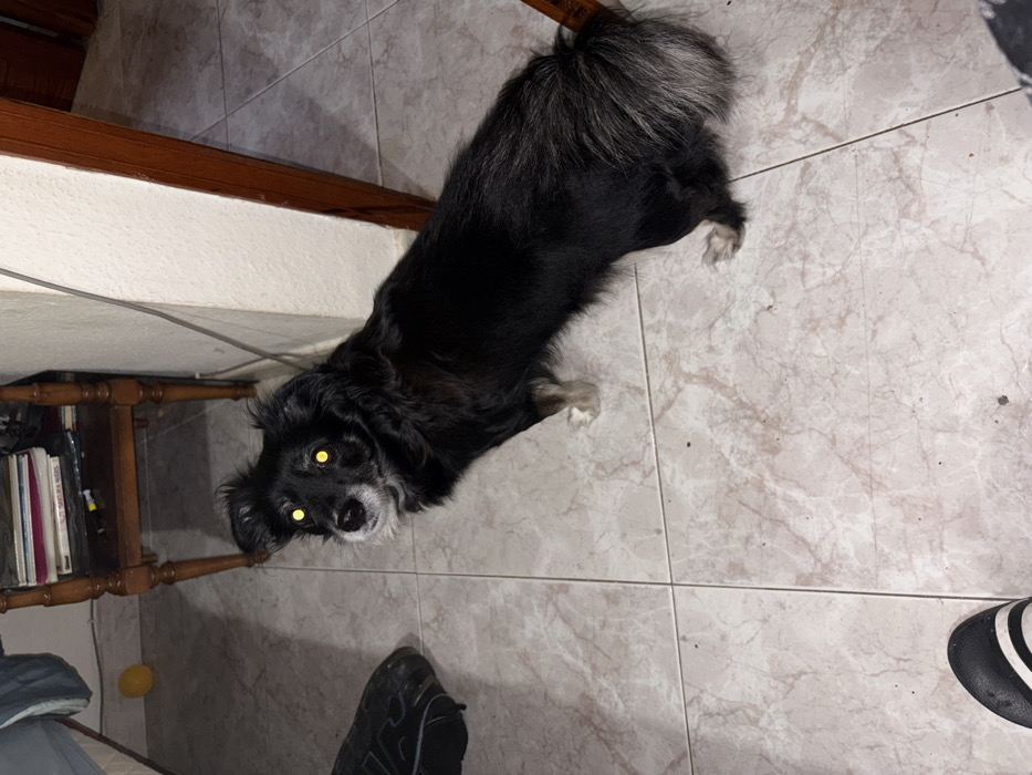 An indoor scene in Icod de los Vinos, Spain, features a black-furred dog with visible graying around its muzzle and chest, and a partially gray tail