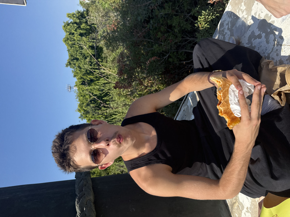 A young male is seated outdoors in bright daylight, assumed to be in Kfar Vitkin, Israel. He wears a black ribbed tank top, loose-fitting black pants, and oval sunglasses with dark lenses. His short, dark hair is visible, and he has a thin mustache. He holds a partially eaten golden-brown pastry with a reddish filling, wrapped in white paper, with both hands. His mouth is puckered forward, and a small amount of food residue is visible on his lower lip. A dark, cylindrical structure with a rope wrapped around it is visible on the left. A yellow bag is partially visible on the ground to the lower left, and a brown paper bag with a clear plastic cup is visible to the lower right. The background features dense green trees and bushes under a clear blue sky, with a distant communications tower visible through the foliage.