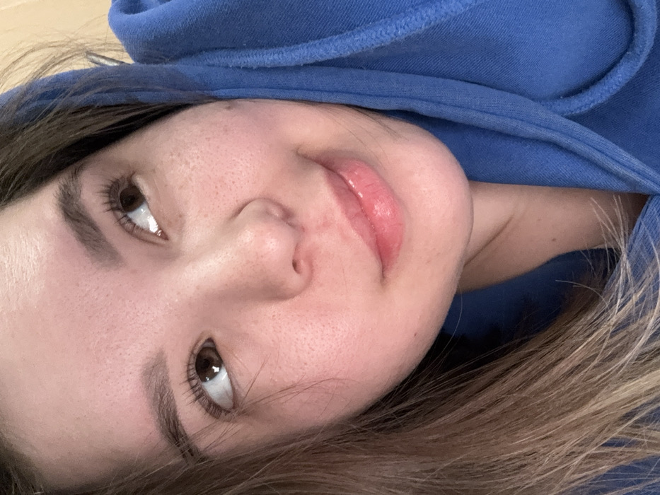 A close-up portrait features a young adult female. Her skin is fair, exhibiting visible pores and sparse freckling on the cheeks and forehead. She has brown eyes, naturally shaped eyebrows, and pronounced eyelashes. Her lips are full with a light, glossy application, curving into a subtle, closed-mouth smile. A small blemish is located on her right cheek. Light brown hair with blonde highlights is visible on the left side of the frame. She is clad in a blue hooded garment, likely a hoodie, with the hood partially obscuring the right side of her head and neck. Her gaze is directed upwards and to the right. The background is uniformly light-toned and out of focus, indicating an indoor environment. This scene is situated in Nizhnekamsk, Russia. No specific visual elements within the image confirm this precise geographic location.