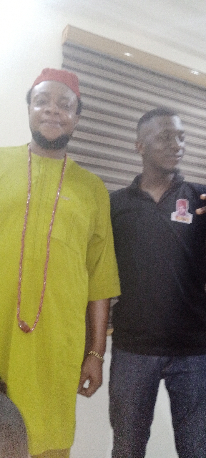 Two men pose for a photograph. The man on the left is wearing a red cap, yellow shirt, and a beaded necklace. The man on the right has a black t-shirt with a small image on it, along with dark blue jeans. The backdrop is composed of blinds and a painted wall.