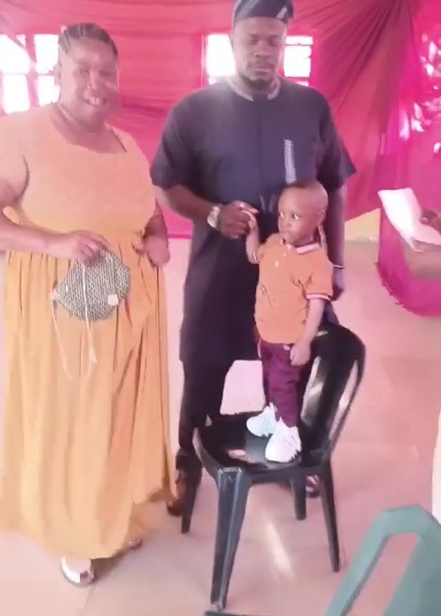 Here is a detailed description of the video: The video shows three people standing in a room decorated with red drapes. On the left, a woman with braided hair is wearing a long gold dress and holding a small, round purse. In the middle stands a man in a black shirt and dark pants, holding the hand of a young child. The child is standing on a black plastic chair and is dressed in a short-sleeved brown shirt, burgundy pants, and white sneakers. The room has tiled floors, and other plastic chairs are visible in the background. The lighting is bright, and a ceiling fan is visible overhead. The atmosphere suggests a casual or celebratory event.