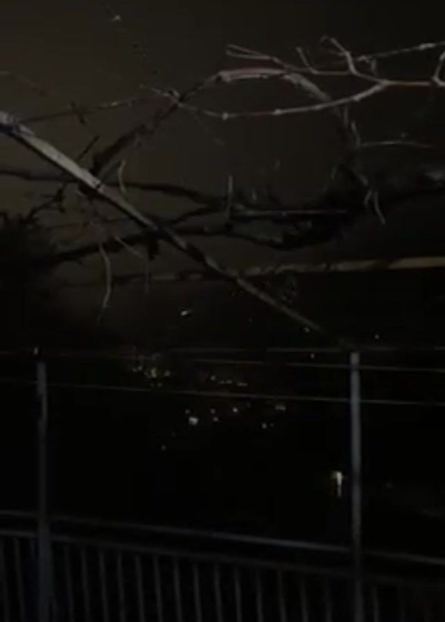 dark, nighttime scene, possibly overlooking a city or town. The focus is on a structure of bare branches and wires, seemingly a vine trellis, silhouetted against the dimly lit sky. In the background, scattered lights suggest urban development. Fireworks sporadically explode in the distance, their brief flashes illuminating the scene. A metal railing lines the bottom of the frame, indicating a balcony or elevated platform. The overall atmosphere is dark and quiet, punctuated by the sudden bursts of light and sound from the fireworks.