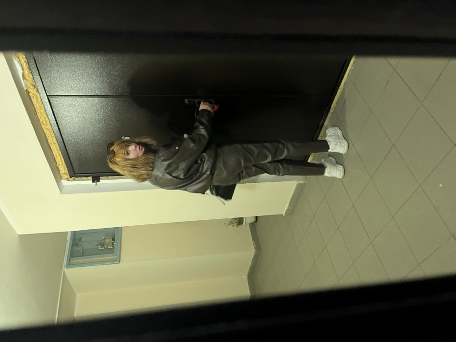 The image displays a female individual inside an indoor hallway, likely in an apartment building in the city of Unknown, Unknown