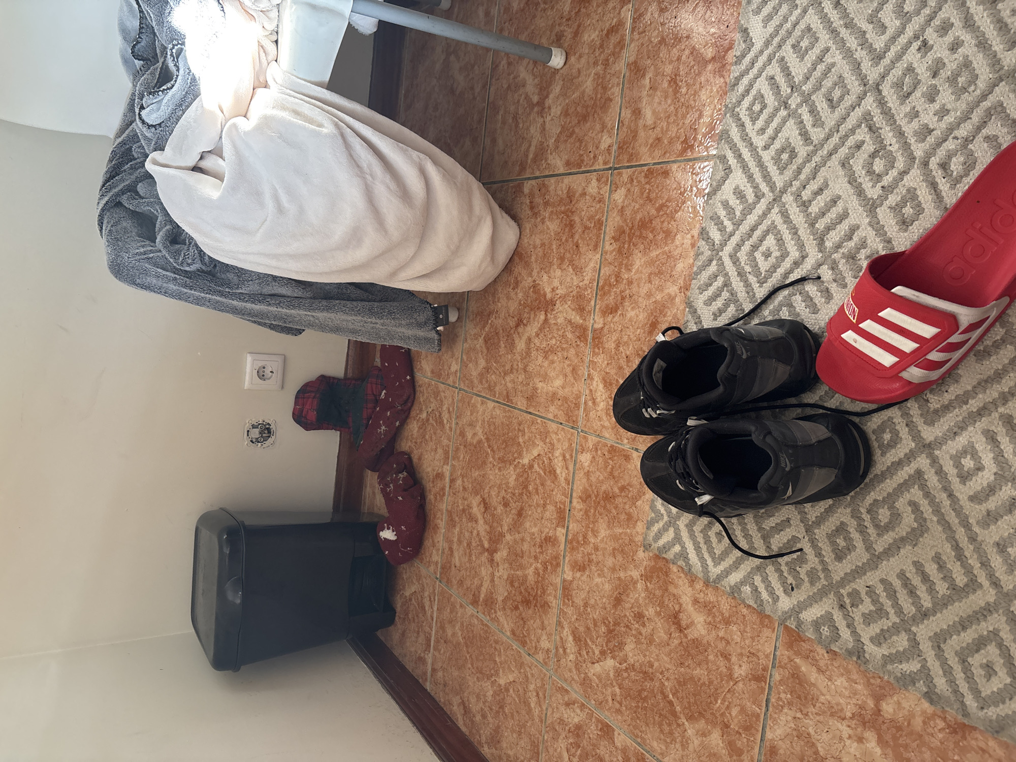 The image displays an interior room in Bragança, Portugal, characterized by light-colored walls and a dark brown baseboard. The floor is composed of reddish-brown marble-patterned tiles with light-colored grout. In the corner, a dark grey or black plastic pedal-operated trash bin is situated. To the right of the bin, a partially disassembled electrical outlet on the wall exposes internal wiring, while a fully assembled European-style two-pin electrical outlet is visible further right, mounted lower on the wall. Below these outlets, two red and black plaid, snowflake-patterned house slippers or socks are resting on the tiled floor. A white chair on the right side of the frame supports a crumpled grey fuzzy blanket and a draped cream-colored blanket, with a bright light source illuminating a section of the cream blanket. In the immediate foreground, a grey and white geometric-patterned rug covers part of the floor. On this rug, a pair of dark grey Nike Air Max athletic shoes, one with an untied lace, are positioned alongside a single red Adidas slide sandal featuring white stripes. No individuals, actions, or interactions are present in the scene.