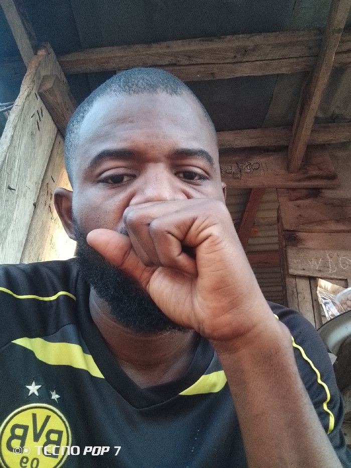 A close-up photograph depicts an adult male in Zango-ndaji, Nigeria, positioned under a rustic shelter. The subject, a Black male with closely cropped dark hair and a short, dark beard, is wearing a black short-sleeved t-shirt with yellow trim and a "BVB" logo with two white stars on the chest. His right hand is raised, forming a closed fist that rests against his chin and mouth, partially obscuring his lower face. His eyes are directed towards the camera. The background reveals weathered wooden beams and planks, supporting a dark, possibly corrugated metal, roof structure. Indecipherable markings are present on the wooden surfaces. In the far right background, a clear plastic bag containing what appears to be peanuts is visible. A "TECNO POP 7" watermark is present in the lower left of the image.