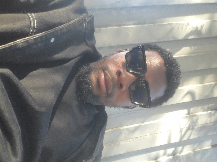 An adult male with a dark complexion, short dark curly hair, and a dark beard is depicted in a close-up, chest-up view, appearing to be a selfie, in Bar Jirgi Summa, Nigeria