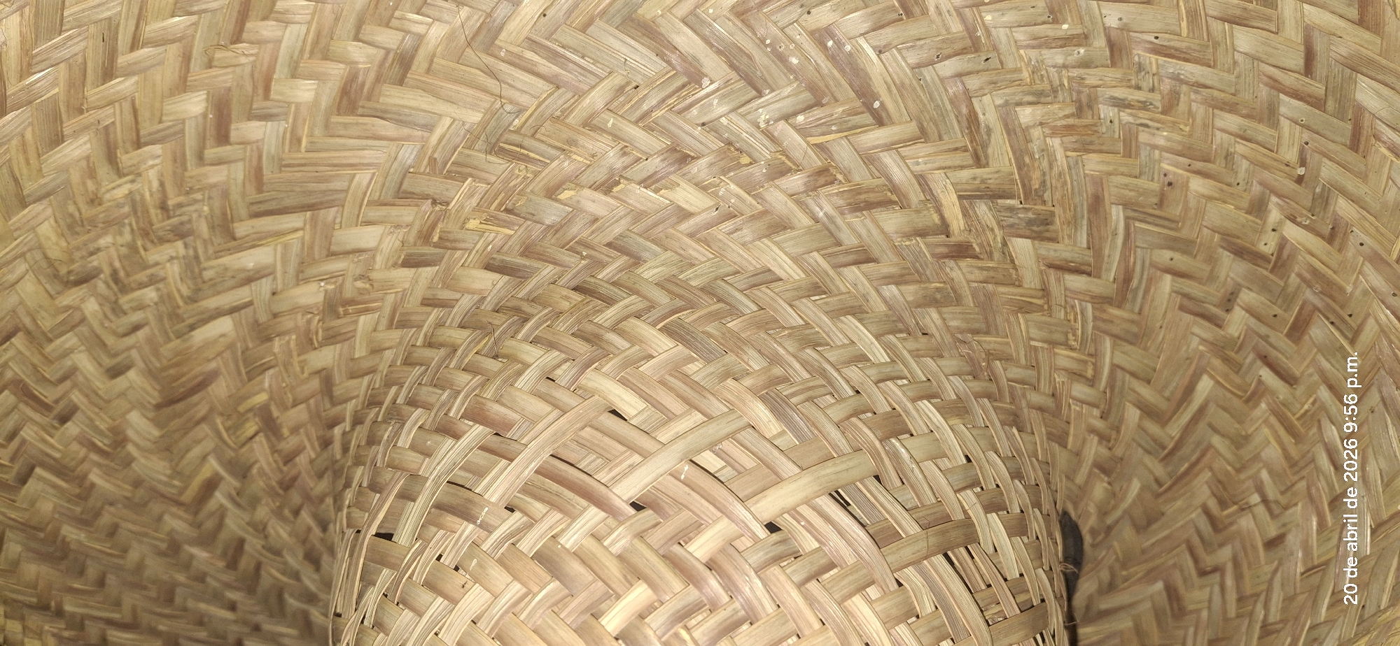 A close-up view captures the textured surface of woven material, exhibiting a repetitive pattern of interlaced strips. The color palette is dominated by warm, earthy tones ranging from light beige to deeper browns, creating a sense of depth and dimension. The photograph includes the date "20 de abril de 2026 9:56 p.m." along the right edge.