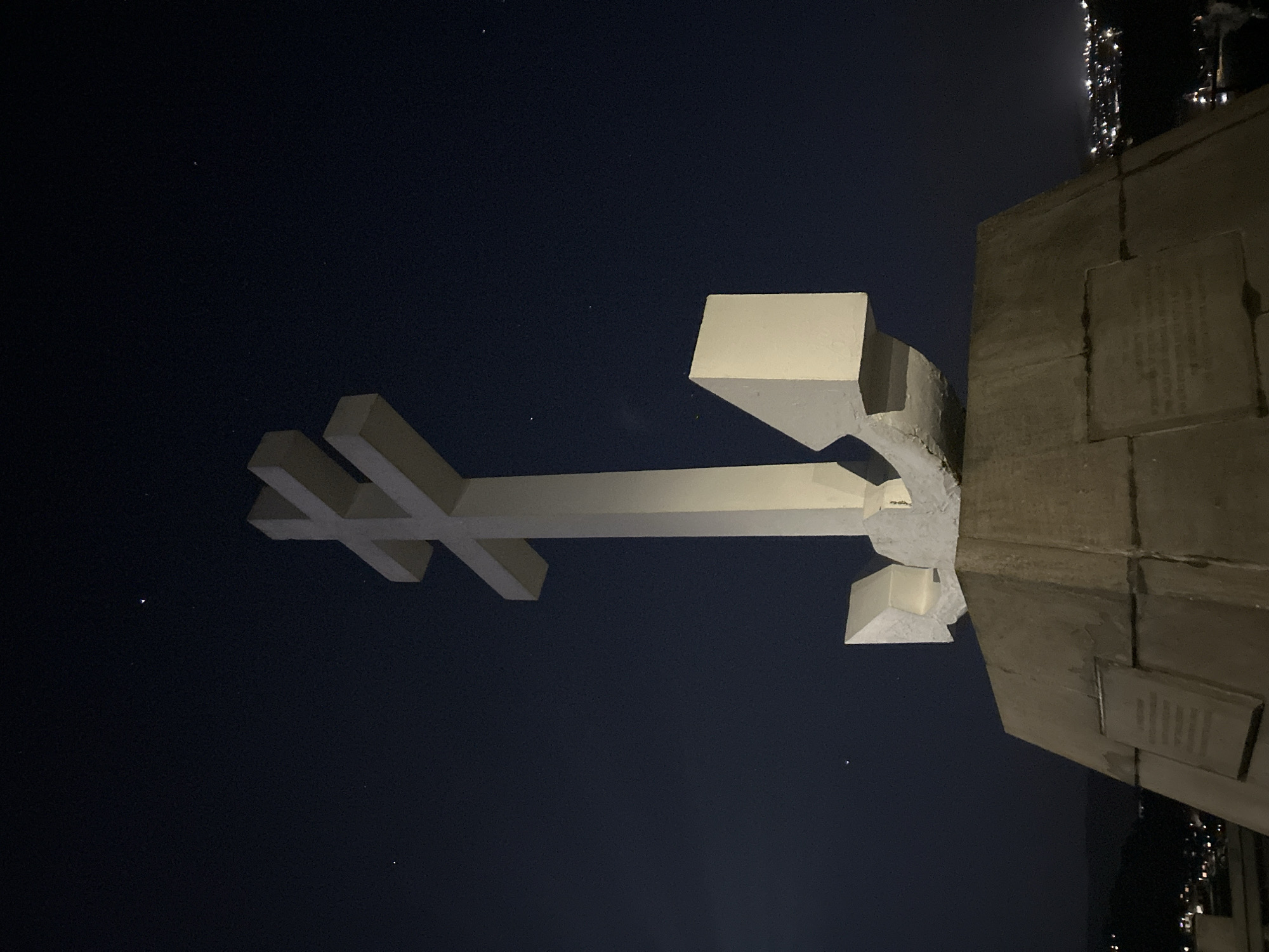 At night in Gourock, United Kingdom, a concrete structure featuring a large, illuminated white cross is captured in the lower half of the frame against a dark, starry sky. The cross, comprised of intersecting rectangular sections, extends horizontally from the central base of the structure. The structure itself, partially visible on the right, features layered concrete blocks and several plaque-like elements affixed to its surface. The lighting is muted, emphasizing the stark contrast between the illuminated cross and the dark sky. Distant city lights are visible along the upper right edge of the image.