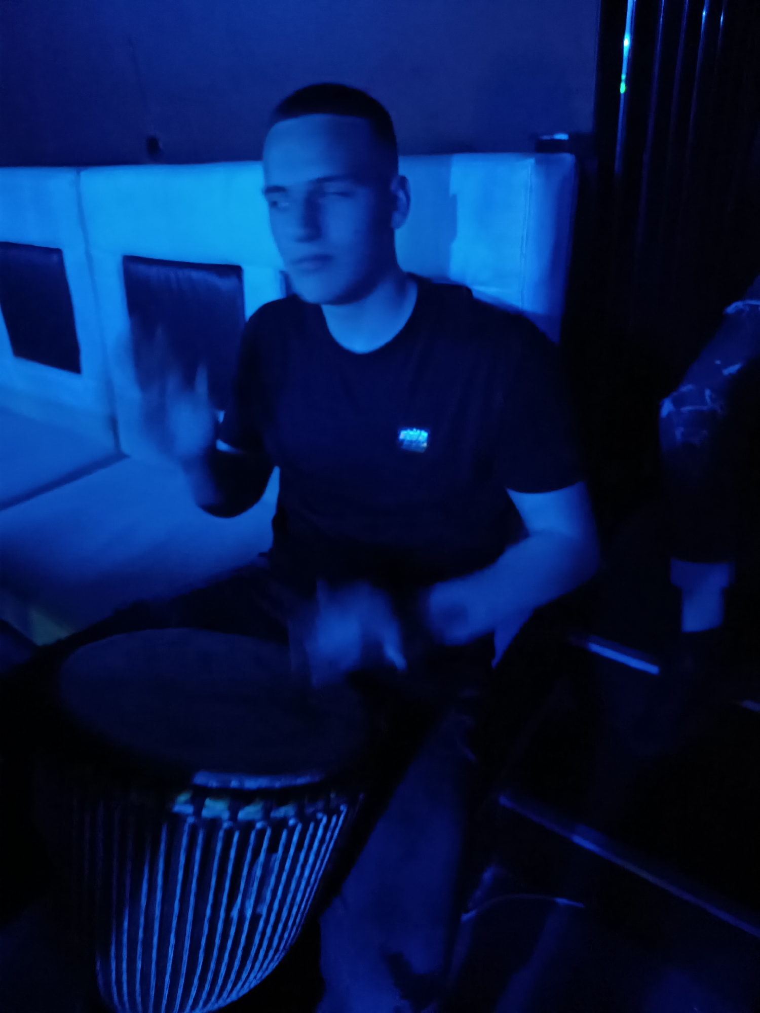 A man is seated and playing a djembe. He wears a dark t-shirt. A couch is behind him. The lighting is a strong blue hue. The location is Septemvri, Bulgaria.