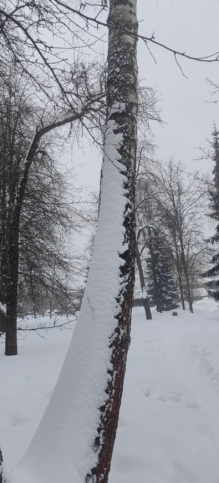 The image depicts a winter scene in Mytishchi, Russia, characterized by heavy snowfall and an overcast sky. The foreground is dominated by a tree trunk positioned on the right, covered in a thick, irregular layer of white snow on its visible side, with segments of reddish-brown and possibly white bark exposed. The ground is completely blanketed in pristine white snow, with a narrow, compressed snow path or track visible along the far right edge of the frame, extending into the midground. Fine, sparse snowflakes are discernible in the air. In the midground, numerous deciduous trees with bare, dark branches stand, many bearing patches of snow on their limbs and trunks. Towards the right midground, several evergreen trees, likely spruces or firs, are visible, their dark green needles dusted with snow. A dark, low-lying object, possibly a bench or waste receptacle, is partially visible near the base of these evergreen trees. The background consists of a uniformly gray, cloud-covered sky and a dense arrangement of snow-covered bare trees receding into the distance. No individuals or animals are present, and no active interactions are depicted.