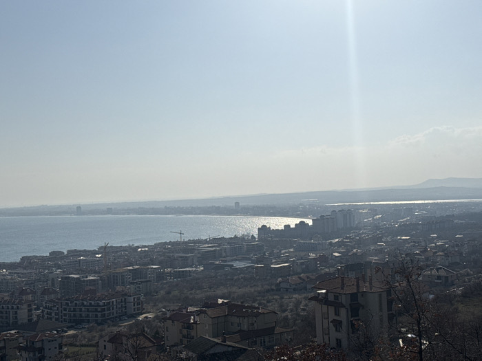 The image displays an elevated panoramic view of Sveti Vlas, Bulgaria, stretching along the Black Sea coastline, under bright daylight