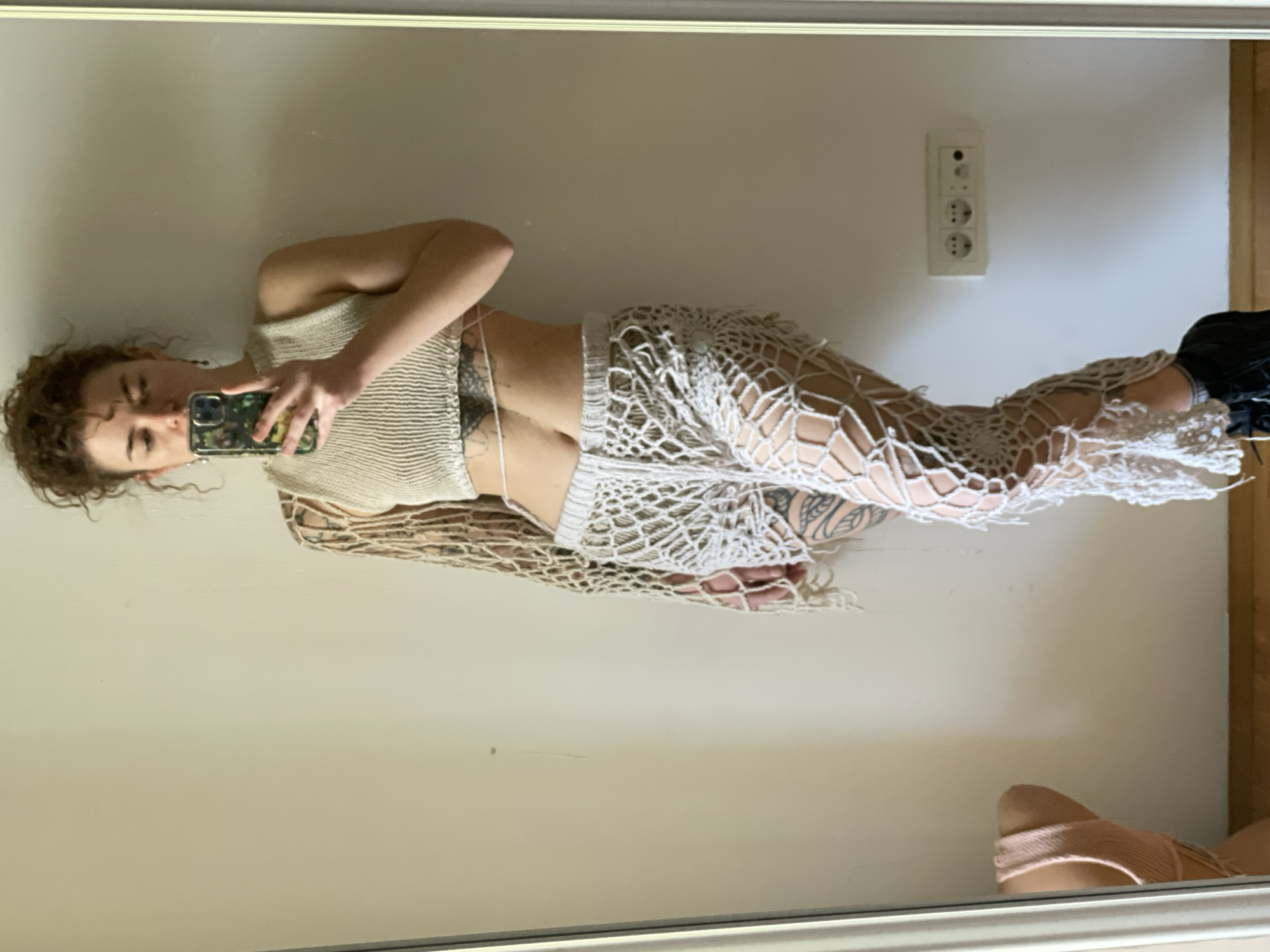 A young woman is posing in a mirror in an indoor setting. She is holding a phone in her left hand, seemingly taking a selfie. She is wearing a light-colored knit top and a matching knit skirt with a fishnet-like pattern. Her hair is curly and appears to be brunette or dark blonde. Tattoos are visible on her arms and torso. An electrical outlet is visible on the wall behind her. A partial view of a light pink shoe can be seen in the reflection. The location is likely indoors and does not have details confirming the city of Boreti, Montenegro.