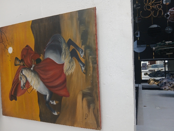 The image displays an indoor scene, situated in the city of Jos, Nigeria. Dominating the upper portion is a large, rectangular painting, likely oil on canvas, affixed to a white, textured wall. The artwork depicts a figure wearing a gold conical hat and a prominent red flowing cape, mounted on a white horse rendered in grey and blue tones. The horse is captured in a dynamic, rearing pose. The background features an arid landscape with dark mountains against an intense golden-orange sky, indicative of dusk or dawn. A full white moon is visible in the upper right, with sparse, dark tree branches silhouetted against it. A signature, "B. Zayyan," along with a year, possibly "1951" or "1954," is inscribed in the painting's lower-left corner. Below this artwork, a white architectural element, possibly a ceiling beam or archway, separates the wall from an open retail space. The interior of a commercial establishment is visible, featuring multiple mannequins dressed in patterned garments; one mannequin in the left foreground has a distinctive gold-colored head. A human figure, clad in light-colored jeans and a white top, stands deeper within the shop, holding a white rectangular sign displaying red text. The shop's interior walls are dark, decorated with circular elements and gold lettering that spells "Casa Sáñ," identifying the establishment.