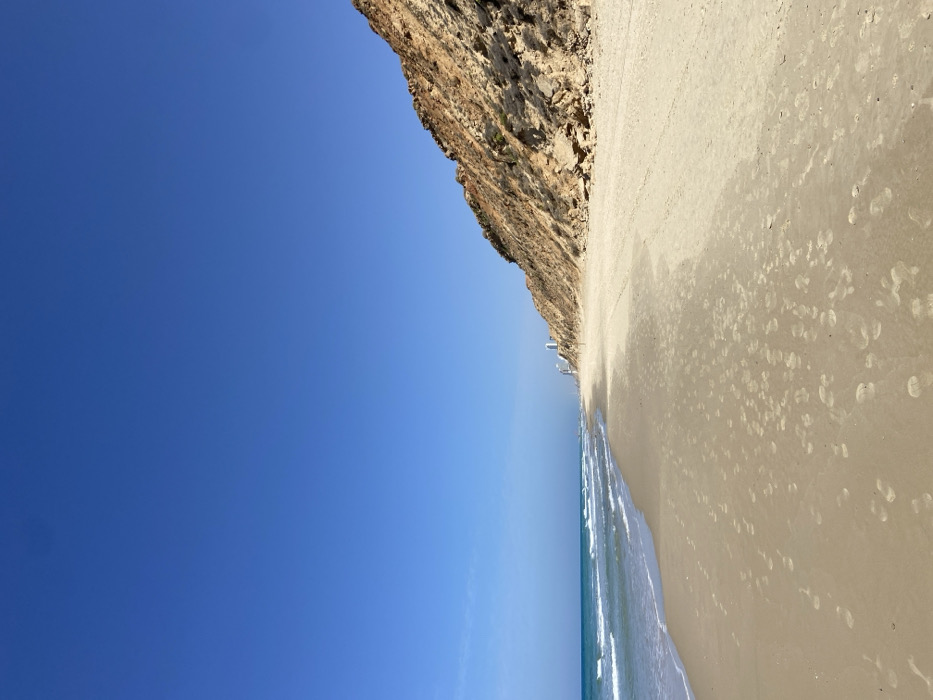 A wide-angle photograph captures a deserted sandy beach under a clear, deep blue sky in Unknown, Unknown. The scene is dominated by three primary elements: the sky, the sea, and the coastline. The top half of the frame is a cloudless, vibrant blue sky. To the left, the light blue-green ocean features gentle white-capped waves breaking on the shore, extending to a hazy horizon. The lower half of the frame is a light beige sandy beach, marked by numerous footprints in the foreground and midground, indicating recent human presence despite no individuals being visible. To the right, a steep, eroded natural cliff face, composed of reddish-brown and sandy-colored earth and rock, runs parallel to the beach. In the far distance along the coastline, several tall, modern buildings are discernible, suggesting an urban area further down the coast. No people, specific objects, or actions are depicted in the immediate scene.