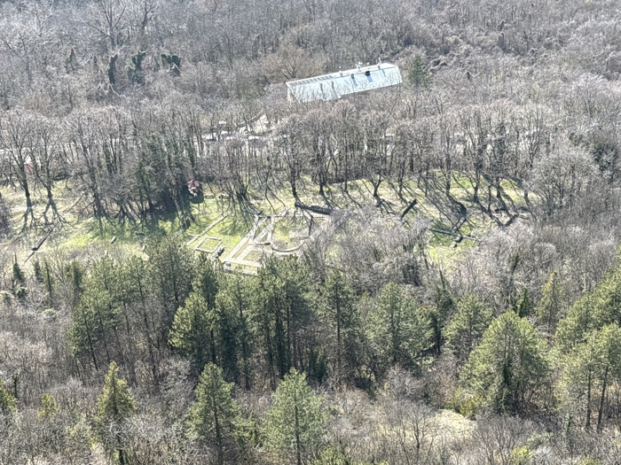 An aerial image captures a forested landscape within Madara, Bulgaria, under clear sunlight. The scene primarily features a mosaic of bare deciduous trees and verdant coniferous trees. In the midground, an archaeological site is visible, presenting excavated foundational structures of ancient buildings, organized into distinct rectangular and curvilinear outlines across patches of green grass. Numerous bare deciduous trees cast elongated shadows across these clearings. Further in the background, a long, light-colored building with a grey roof is partially visible through the trees. A smaller structure with a red roof is also discernible near the archaeological ruins. No individuals or specific actions are observed within the frame.