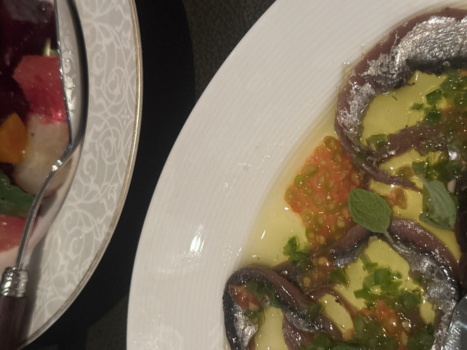 A close-up shot showcases two white plates. The plate on the left holds a colorful salad with a silver fork resting on its rim. The plate on the right contains what appears to be a seafood dish, possibly featuring anchovies adorned with edible silver leaf. The dish is garnished with green herbs and a vibrant orange relish, all swimming in a clear liquid, likely oil or a light sauce. The composition is tightly cropped, focusing on the food and the elegant dinnerware.