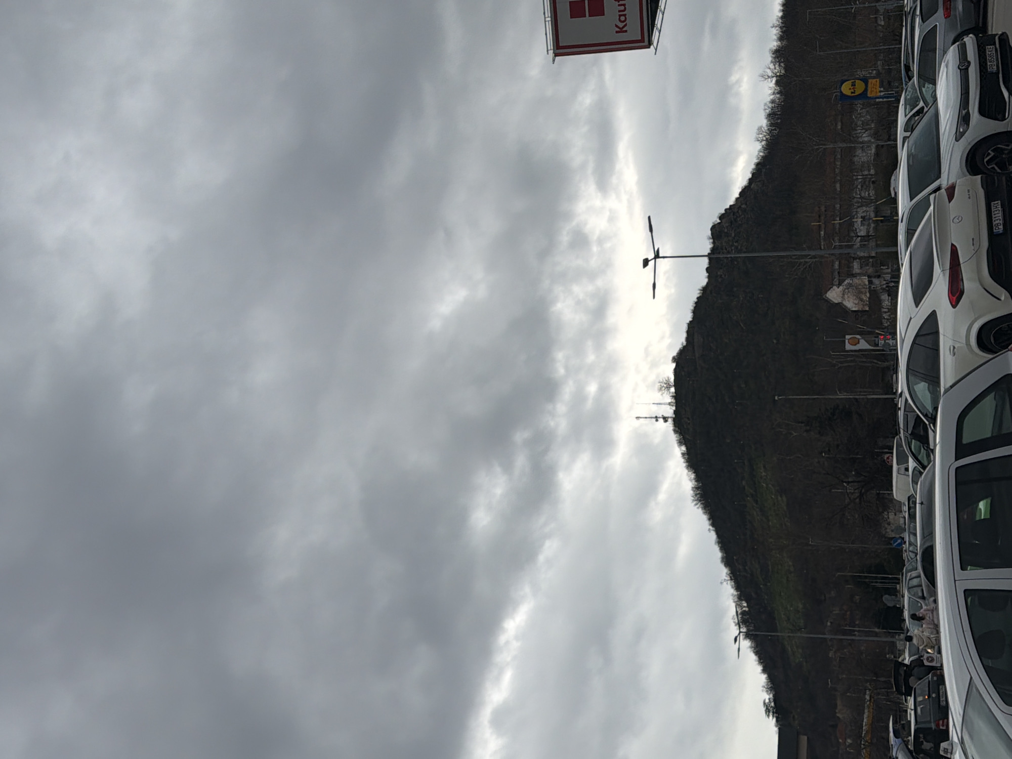 This image captures an outdoor scene from a crowded parking lot in Plovdiv, Bulgaria, specifically located near the commercial area on Bregalnitsa Street, with Bunardzhika Hill (also known as Alyosha Hill) prominently dominating the background. The sky is entirely overcast with a uniform layer of dense grey clouds, providing diffuse light to the scene. Bunardzhika Hill rises steeply, covered in predominantly bare deciduous trees, indicating a dormant season, possibly winter or early spring. Several communication towers and antennae are visible at the hill's summit. The foreground and mid-ground are occupied by an asphalt parking lot densely packed with various passenger vehicles. A white Mercedes-Benz SUV with Bulgarian license plate "PB 3113 HX" is parked in the mid-left foreground, adjacent to a white Volkswagen SUV bearing Bulgarian plate "PB 8585 KE". Numerous other cars, including a dark-colored vehicle with an open trunk on the far left and a white van further back, fill the lot. Two individuals, dressed in light-colored outerwear, are visible walking between parked cars in the mid-ground. Tall, black streetlights with multi-directional lamps are strategically placed throughout the parking area. Commercial signage is evident: a partial, large red and white "Kaufland" sign is visible on the far right, while a prominent blue and yellow "Lidl" sign is seen in the mid-right background at the base of the hill. A yellow and red "Shell" gas station sign is partially visible to the left of the Lidl sign. Behind the parking lot and closer to the hill, an older, light-colored building with a dark roof is visible among other less discernible structures.