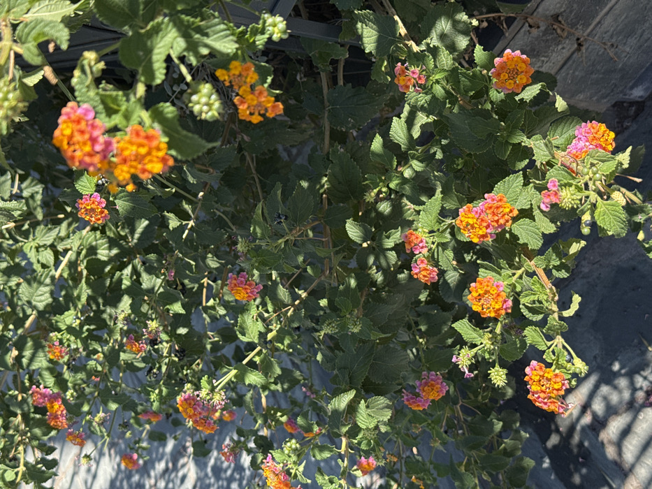 A close-up, high-angle view depicts a densely growing Lantana camara shrub, situated in Santa Rosa, Argentina. The plant is characterized by numerous clusters of small, multi-colored flowers, displaying a blend of pink, orange, and yellow hues. Abundant dark green, ovate leaves with serrated margins are visible throughout the foliage. Several green, undeveloped flower buds and small, dark, round berries are interspersed among the leaves and flowers. The plant grows over a dark ground cover material, possibly a landscape fabric or mulch. A lighter gray, likely concrete or paved surface, is partially visible on the left side, receiving dappled sunlight. A dark, indeterminate structural element, possibly part of a fence or planter, appears on the right edge. The scene is illuminated by direct sunlight, casting distinct shadows. No people, animals, or explicit man-made objects, beyond the implied ground cover and structure, are present. No actions or interactions are depicted.
