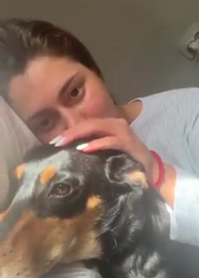 A young woman is lying down with a dachshund resting its head on her chest. She is gently stroking the dog's head. She has fair skin and brown hair pulled back from her face. She wears a light-colored, long-sleeved shirt and a red bracelet. Her fingernails are long and painted white. The dog is black and brown. Sunlight streams in, illuminating the scene. A electrical outlet is visible on the wall behind them.