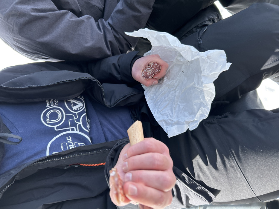 The image depicts two individuals engaged in an outdoor activity in Villard-sur-Doron, France. A central figure, dressed in a black unzipped jacket over a dark blue V-neck t-shirt featuring white graphics partially legible as "SÉCU CABLE" and "Protec collective individu," holds a thin slice of cured sausage between the thumb and forefinger of their left hand. A small wooden paddle is also held in their left hand. The individual's right hand grasps a larger segment of cured sausage, which rests on crumpled white paper on their lap. A second individual is partially visible to the right, wearing dark clothing. The scene is illuminated by bright sunlight, casting distinct shadows on the garments, and the visible ground surface at the bottom of the frame is light-colored.