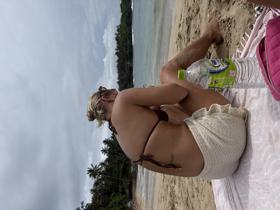 A woman sits on a sandy beach, facing the ocean. She wears a brown bikini and knitted white shorts. A partially empty water bottle rests beside her on a striped towel. Lush, green trees line the shore, and the sky is overcast. The beach is bright, contrasting with the dark trees and cloudy sky. The woman's blond hair is pulled back.