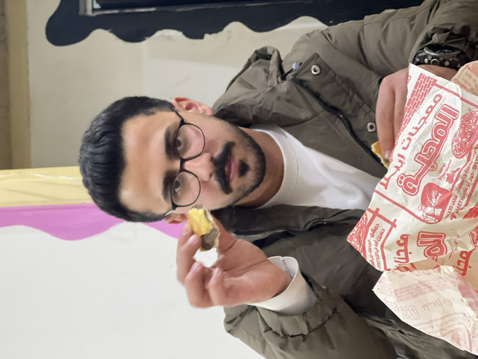 A male individual, appearing to be in his late twenties or early thirties, with dark hair, a moustache, and black-rimmed glasses, is positioned centrally in an indoor setting. He is wearing a dark olive-green puffer jacket over a white long-sleeved shirt and a dark watch on his left wrist. He looks directly forward. His right hand is extended, holding a partially consumed small sandwich or pastry with a light-colored bun and a dark filling. His left hand is holding a white paper wrapper adorned with red Arabic text and graphics, indicating "معجنات أبيض المحلية" (Local White Pastries) and listing specific Damascus locations and phone numbers. The background consists of a light-colored wall featuring a vertical pink wavy decorative element and a vertical yellowish-beige strip. The scene is located in the city of Al-Qanawat Municipality, Syria.