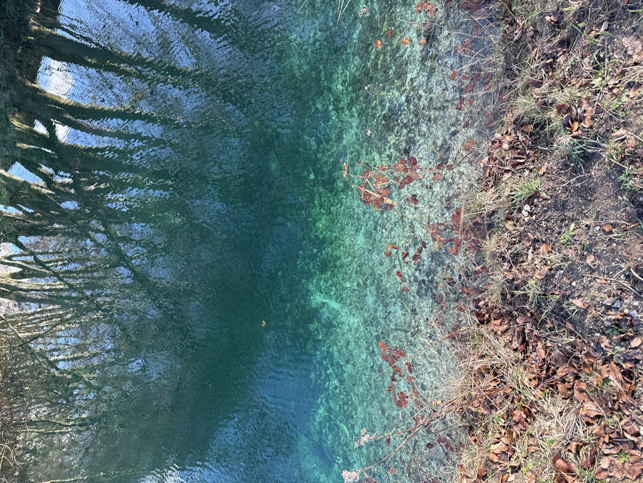 The image displays a clear, stratified body of water bordered by an earthen bank, situated in West Suffolk, United Kingdom. The upper segment of the water is a deep greenish-blue, reflecting the silhouettes of bare deciduous trees and a bright sky, with surface ripples distorting the reflections. Below this, the water lightens to a vibrant turquoise, revealing a bottom composed of uniformly small, light-colored stones or pebbles. Scattered dark brown fallen leaves are visible on the submerged bed. The immediate foreground consists of the bank, a strip of dark soil extensively covered by a dense layer of dry, dark brown deciduous leaves. Interspersed among the leaves are sparse patches of dry, light brown grass and minimal green vegetation. Several thin, leafless stems and some with clusters of reddish-brown leaves extend from the bank, partially submerged in the transparent water. No human figures or man-made objects are present.