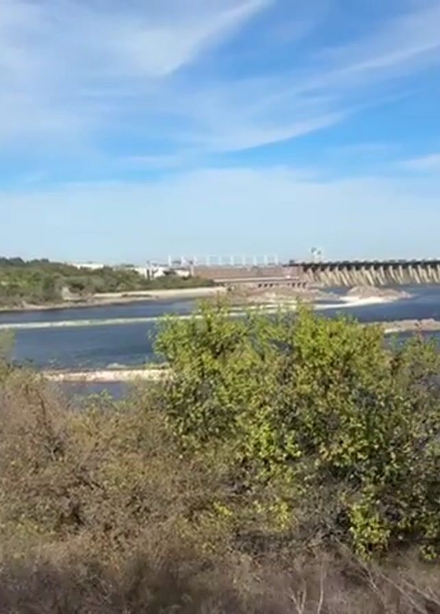 dam on a body of water with green foliage in the foreground. The dam is long and stretches across the water, with water cascading over it. The water appears dark blue, and there are sandbanks visible in the water as well. The sky is blue with wispy white clouds. Some buildings can be seen in the far distance. The foliage in the foreground consists of green bushes and brown, dry branches. The viewpoint appears to be from a slightly elevated position.