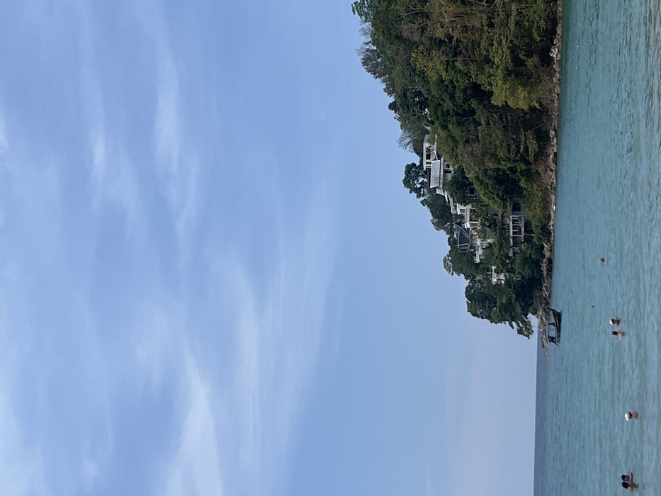 The scene captures a tranquil coastal landscape. Azure water stretches towards the horizon, dotted with several swimmers. Adjacent to the water is a lush, densely vegetated cliffside with houses nestled amongst the trees. The sky, a soft blue, is brushed with faint wisps of clouds. The composition is horizontally oriented, with the sky dominating the left side and the water and cliff occupying the right.