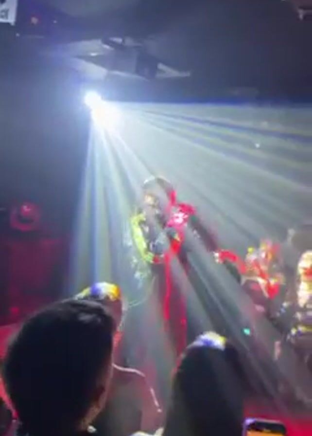 A concert is in progress on a stage, illuminated by a spotlight that shines over the performers and into the audience. The performer in the center is wearing a dark outfit with red accents and appears to be rapping into a microphone. There are several people on the stage, including another individual to the right, partially obscured. The audience consists of dark silhouettes in the foreground, with phones raised to record the performance. There are beams of light slicing through the air, and the overall atmosphere suggests a dark and energetic music event.