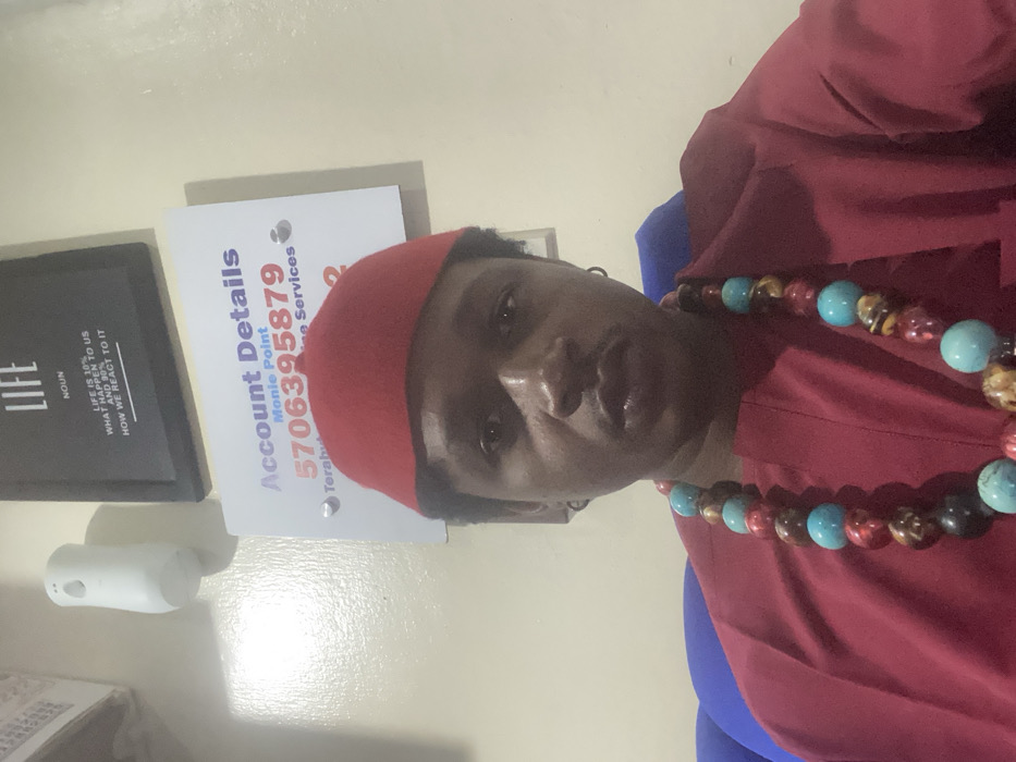 A male individual with dark skin, short dark hair, and a thin mustache is centered in a portrait-style image, looking directly at the camera with a neutral expression. He wears a red traditional-style cap and a deep red long-sleeved tunic. A prominent, multi-strand beaded necklace with large, rounded beads in shades of light blue, red, brown, and black is visible around his neck. Small black hoop earrings are present in both ears. He is seated on what appears to be a blue upholstered chair or sofa. The background is a light-colored wall. On the upper left of the wall, a white, wall-mounted automatic air freshener dispenser is visible. To its right, a black-framed picture contains white text, including "LIFE," "NOUN," and "LIFE IS 10% WHAT HAPPEN TO US AND 90% HOW WE REACT TO IT." Below this picture and to the right of the air freshener, a white rectangular sign is affixed to the wall, displaying "Account Details" in purple text, "Monie Point" in smaller text, and a red nine-digit number "5706395879" followed by "line Services." Partial text "Terahu" is visible beneath. The setting is indoors, likely a business establishment such as a mobile money or payment service point, located in the city of Unknown, Nigeria.