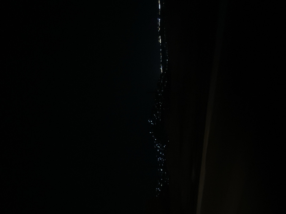 This image presents a nocturnal, long-distance view of the city of Al-Hama, Syria, observed from an elevated vantage point. The upper frame consists of an unilluminated dark sky. A horizontal band of numerous, distinct artificial lights, primarily white and blue, delineates the urban sprawl of Al-Hama across the mid-ground. These lights are distributed over undulating terrain, with some areas exhibiting higher concentrations. The foreground is largely obscured by darkness, featuring a faint horizontal demarcation in the lower-mid section, indicative of an unlit surface or structure. No human figures, discernible objects other than city lights, or specific actions are visible within the frame.
