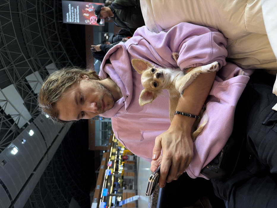 A fair-skinned man with blondish hair wears a lavender hooded sweatshirt, looking down and to the left while holding a phone. A small, tan-colored Chihuahua is nestled in his arms, its head tilted upward toward the viewer. The scene appears to be an airport, with blurred figures and informational displays visible in the background. Overhead, a large metal structure is partially seen. The setting suggests a waiting area.