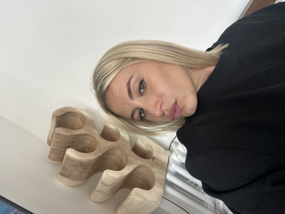 The image displays an adult female posing for a selfie in an indoor setting identified as Limone Piemonte, Italy. The woman, with shoulder-length blonde hair and light-colored eyes, occupies the right side of the frame, looking directly at the camera with her lips slightly pursed. She is wearing a plain black long-sleeved top or sweater. In the background, mounted on a white wall, is a light-colored wooden wine rack with an organic, wavy design featuring multiple empty bottle slots. A white, ribbed radiator is partially visible below the wine rack on the left. A small portion of a dark-framed screen is discernible in the upper left corner of the image.