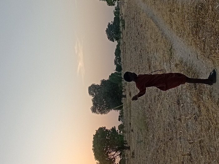 A person in a red outfit stands on dry grass in a field beneath a twilight sky. The ground is a mix of light tan and brown hues. Tall grass clumps are interspersed across the landscape. Sparse trees are visible along the horizon. The sky fades from a pale blue-gray at the top to a light orange near the bottom edge of the frame. A dirt path cuts through the field.