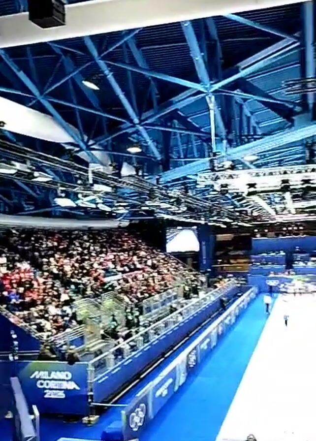 high-angle view of an indoor curling arena during what appears to be a curling competition. Several curling lanes are visible, each with a blue surface and concentric circles at the target end. Multiple people are on the ice, presumably competitors or officials, some walking and some standing near the lanes. The arena has a large seating area filled with spectators, and there are bright lights illuminating the scene from above. The arena's ceiling is a complex structure of metal beams and supports. The Olympic rings are prominently displayed. The Milano Cortina 2026 logo can be seen near the front. A scoreboard is also visible. The atmosphere seems busy and active.