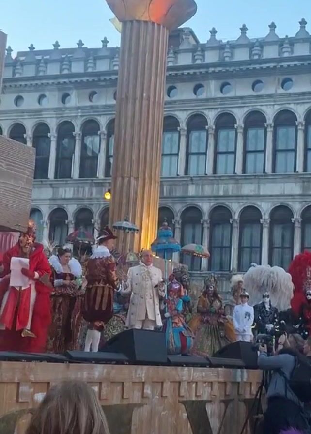 stage set up in front of a large building with many windows. Several people in elaborate, historical costumes are standing on the stage. There is a tall, artificial column with a golden, flame-like structure on top. The people on the stage are holding parasols and papers. There are photographers and spectators in front of the stage. A woman wearing a safety vest stands among the spectators. The sky above is light blue.