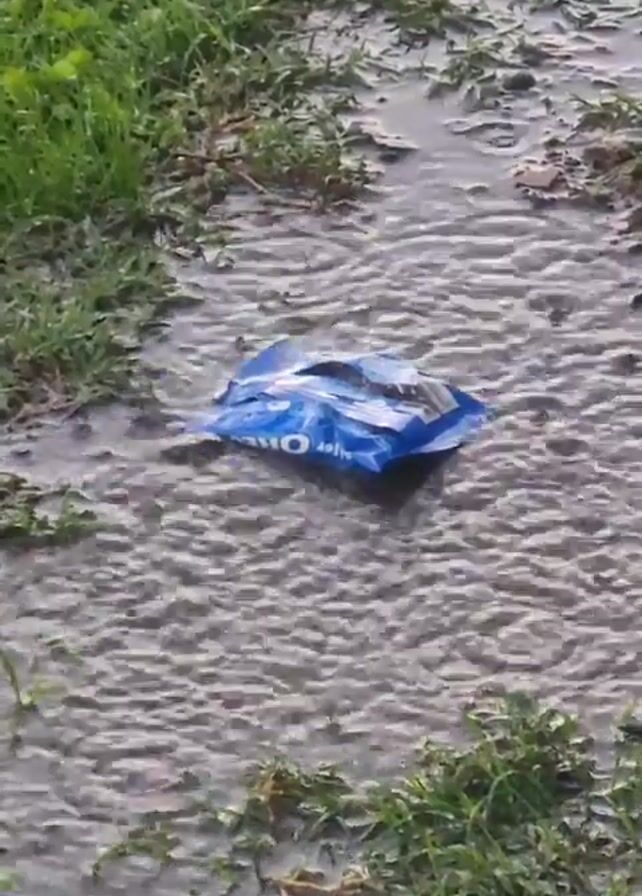 discarded blue Oreo cookie package floating in a shallow puddle of water
