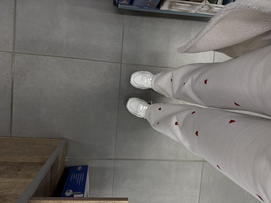 A first-person, downward-angle image depicts a person standing in an indoor retail or storage environment in Sofia, Bulgaria. The subject's legs are visible, clothed in white wide-leg trousers or sweatpants patterned with numerous small, red heart motifs. They wear white chunky athletic shoes with reflective silver accents on the laces and tongue. The right side of the frame shows a partial view of a light-colored, possibly white or off-white, fuzzy or sherpa-lined garment. The floor consists of large, rectangular grey tiles separated by dark grout lines. To the immediate left, a portion of a light brown wooden cabinet or shelving unit with a silver metallic trim is visible, beneath which a partially obscured blue cardboard box with white text is present. To the right, another dark, partially visible structure, possibly a shelf or display, can be seen at the edge of the frame. The area is illuminated by overhead lighting, creating reflections on the shoes and tiled floor.